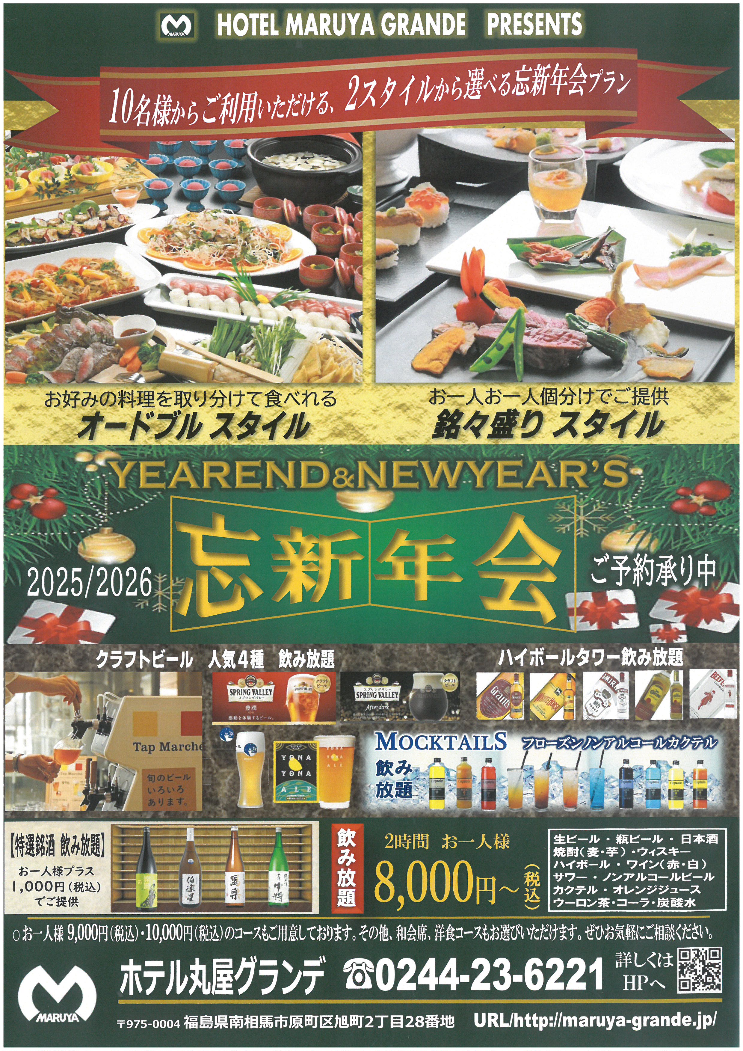 瓶ビール、生ビール、ノンアルビール、ウーロン茶、ジュース、コーラ、ハイボール、ワイン、サワー、焼酎、日本酒、・クラフトビール、(4種スプリングバレー、豊潤、アフターダーク、よなよなエール、銀河高原)ハイボールタワー付き(スコッチ、バーボン、焼酎、ウォッカ、ジン、テキーラ) ・特選純米酒祭(冩楽、田酒、楽器正宗、伯楽星、廣戸川、等)をご用意みちのくのおいしい酒をプラス1000円で飲み放題