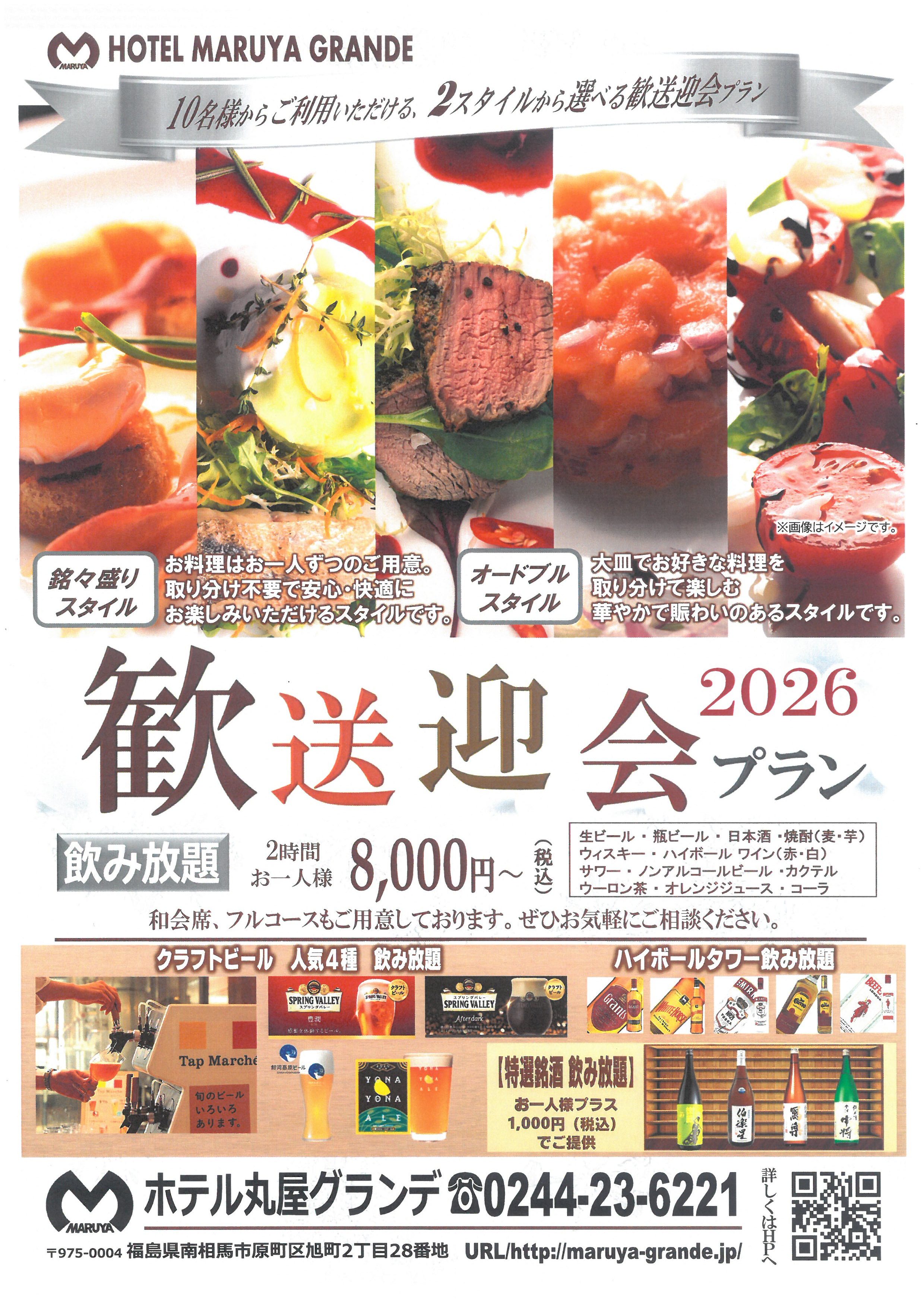 瓶ビール、生ビール、ノンアルビール、ウーロン茶、ジュース、コーラ、ハイボール、ワイン、サワー、焼酎、日本酒、・クラフトビール、(4種スプリングバレー、豊潤、アフターダーク、よなよなエール、銀河高原)ハイボールタワー付き(スコッチ、バーボン、焼酎、ウォッカ、ジン、テキーラ) ・特選純米酒祭(冩楽、田酒、楽器正宗、伯楽星、廣戸川、等)をご用意みちのくのおいしい酒をプラス1000円で飲み放題